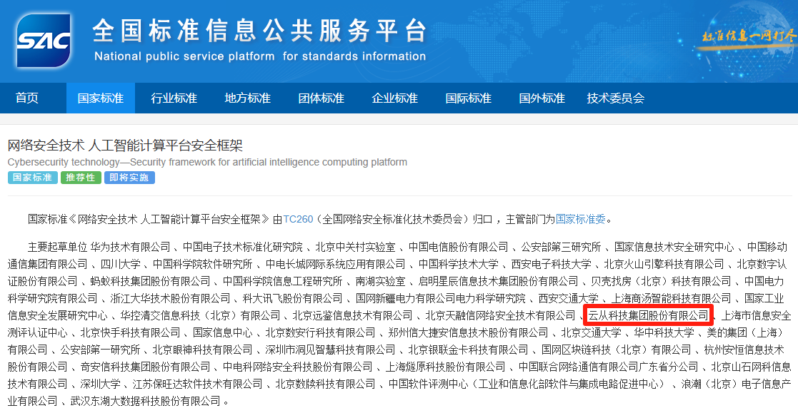 近日,國家標準GB/T 45958-2025《網絡安全技術 人工智能計算平臺安全框架》正式發布。該標準由全國網絡安全標準化技術委員會歸口管理,華為技術有限公司牽頭,云從科技作為核心起草單位之一,深度參與了標準制定工作。 這項將于2026年2月1日正式實施的國家標準,為人工智能計算平臺建立了系統化的安全框架,規定了安全功能、安全管理和角色安全職責,將有效應對硬件漏洞、訓練數據泄露、對抗樣本攻擊等新型安全威脅。